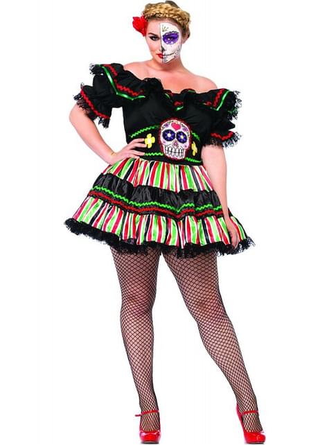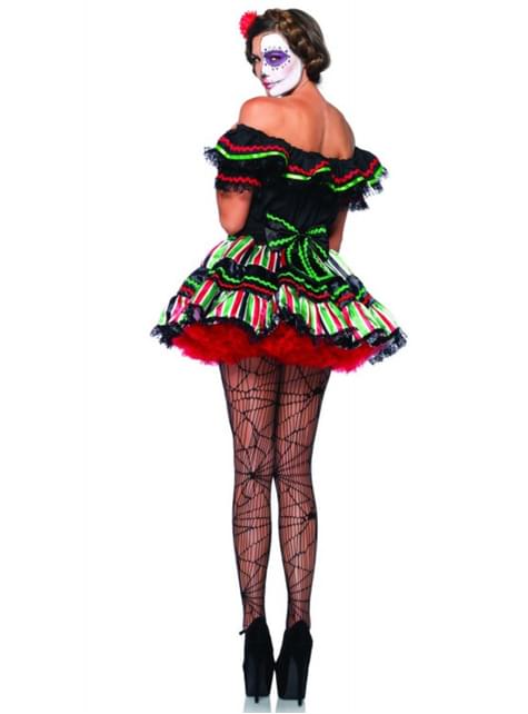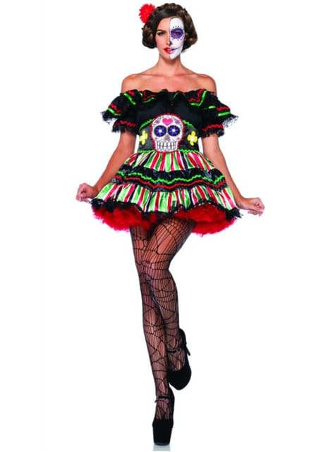 Beinhaltet Minikleid mit herunterhängenden Schultern und Gürtel mit Totenkopfdetail.