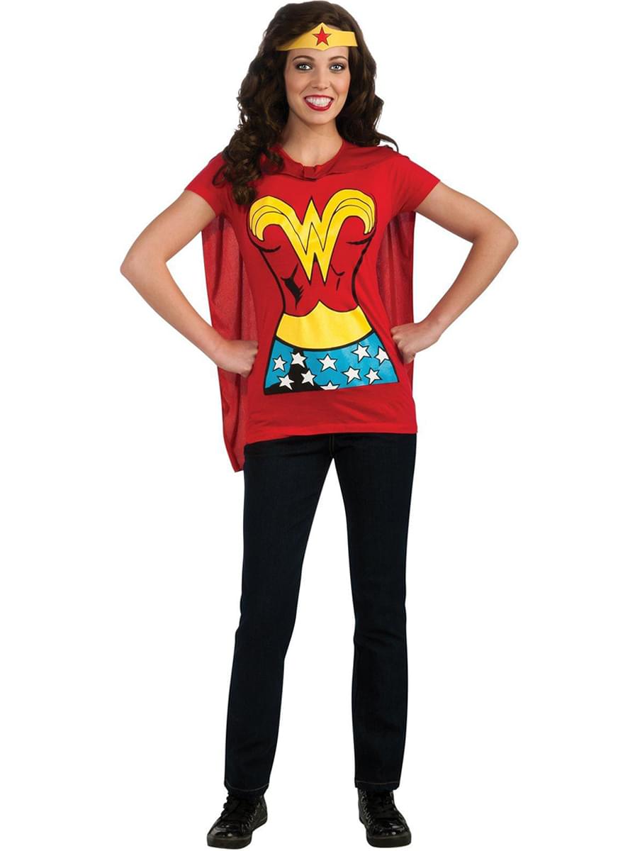 Ce kit comprend un tee-shirt rouge avec la silhouette de Wonder Woman imprimée, avec le symbole jaune sur la poitrine, sa ceinture et sa jupe. Le kit se complète avec le serre tête jaune avec une étoile rouge et une cape rouge