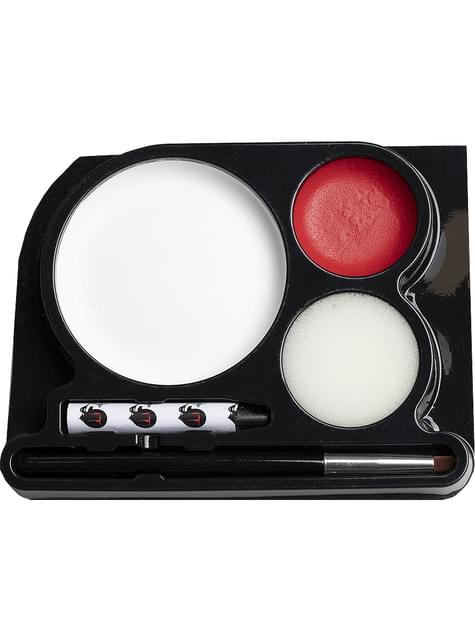 Il set include una palette di trucco a due colori (base bianca e rossa), spugna applicatrice, pennello fine e matita nera per i contorni. La sua texture morbida e facile da stendere consente di creare sia un finish pulito che un effetto più logoro e sinistro. Perfetto per chi cerca un risultato realistico e resistente per tutta la notte, anche alle feste più intense.